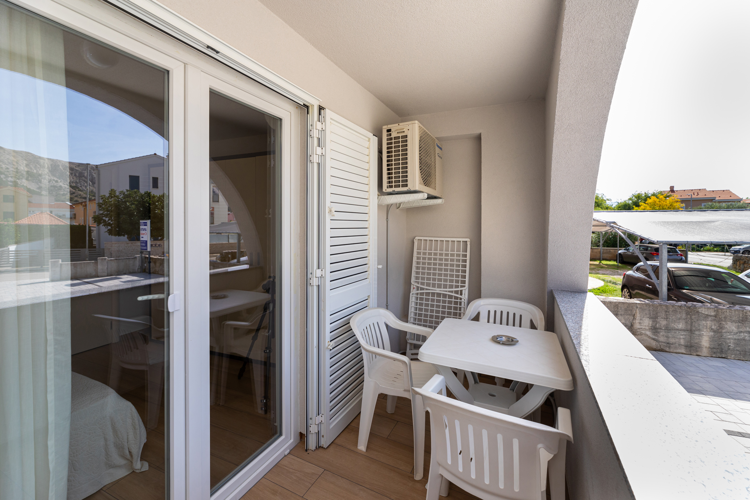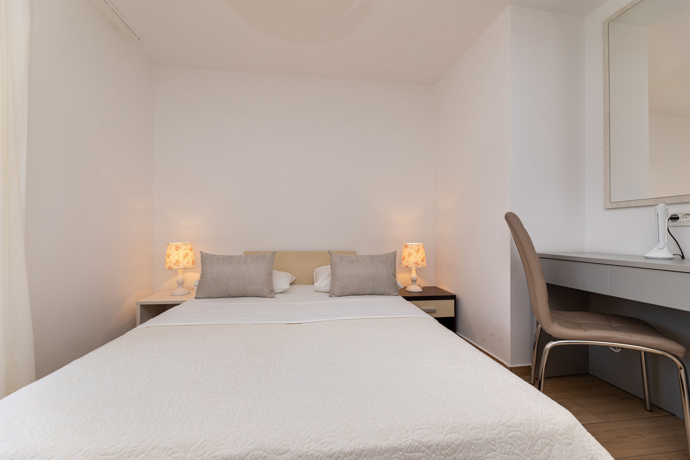 Kuća ima 8 apartmana i 3 studia, svaki ima svoj parking. 2 apartmana su s 2 spavaće sobe, za 4 odrasle osobe ili obitelj s 2-3 djece. 6 apartmana su s 1 spavaćom sobom, za dvije odrasle osobe i 1 dijete. 3 studia za max 2 osobe, br. 5 i 6 su bez balkona, a studio 10 ima balkon. Svi apartmani imaju terasu ili balkon, stol i stolice za sjedenje.