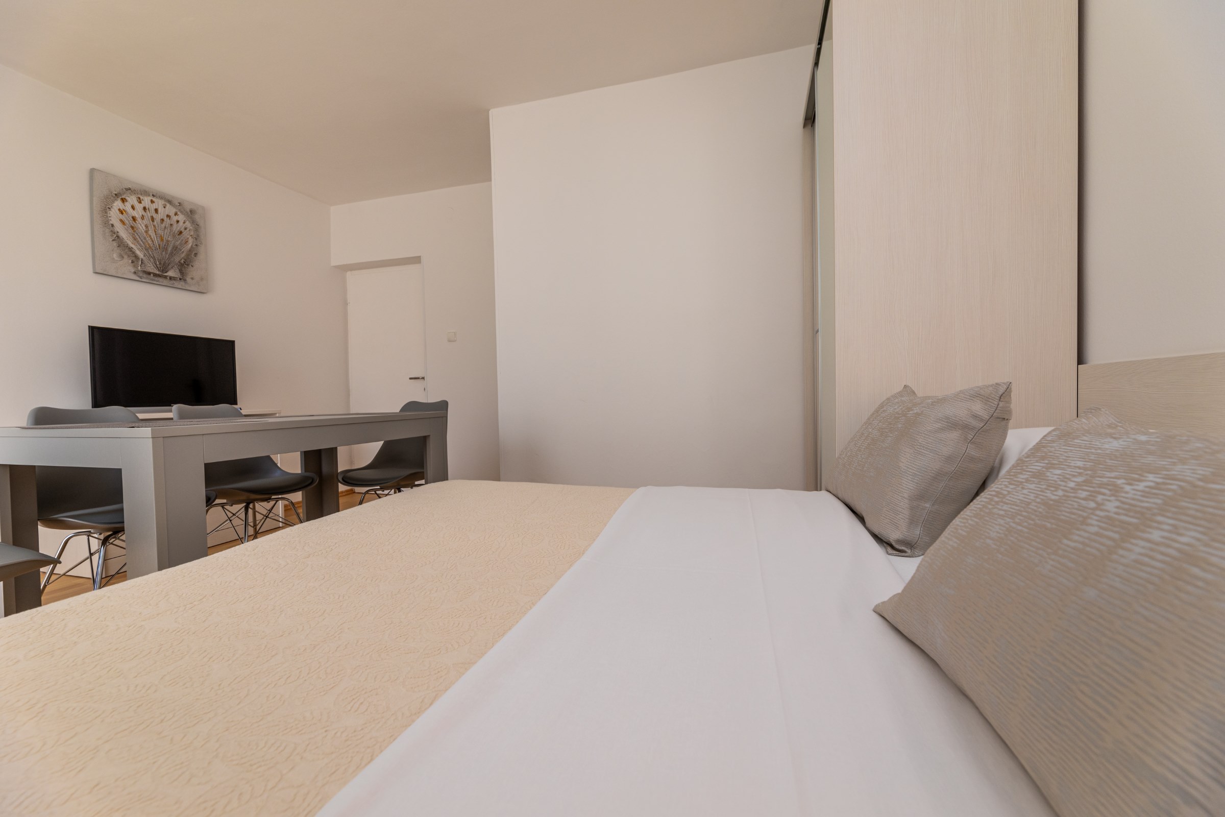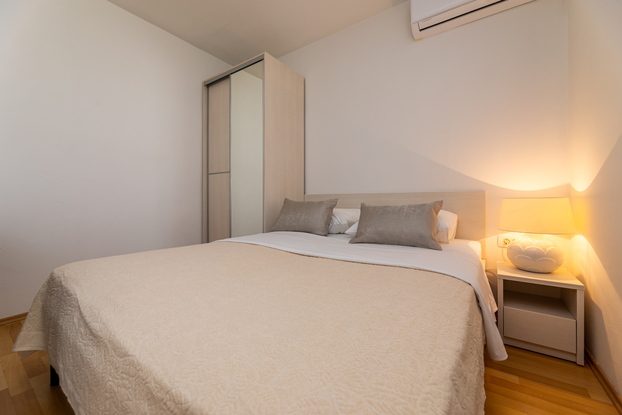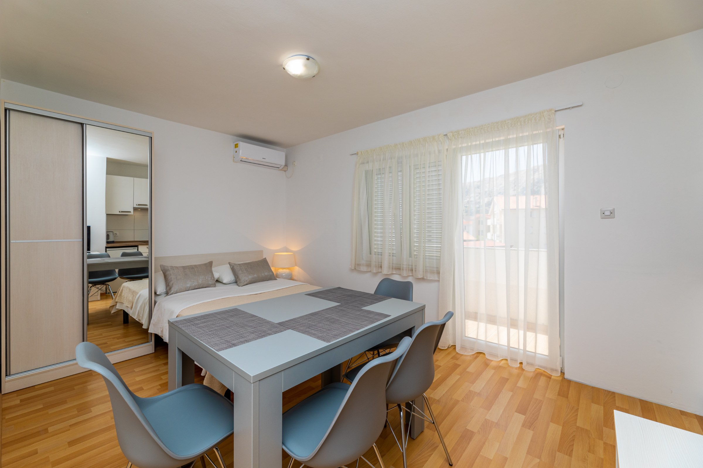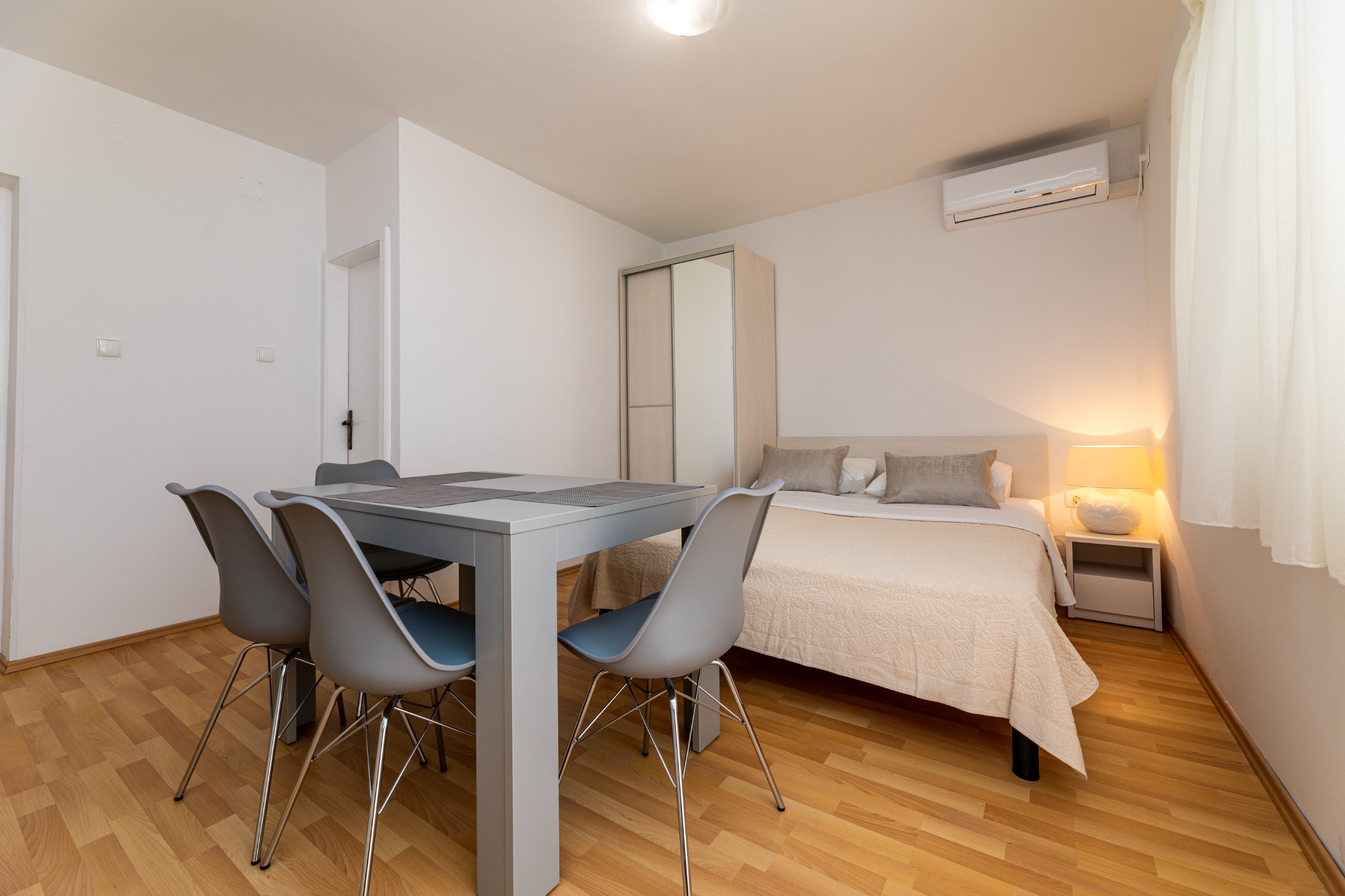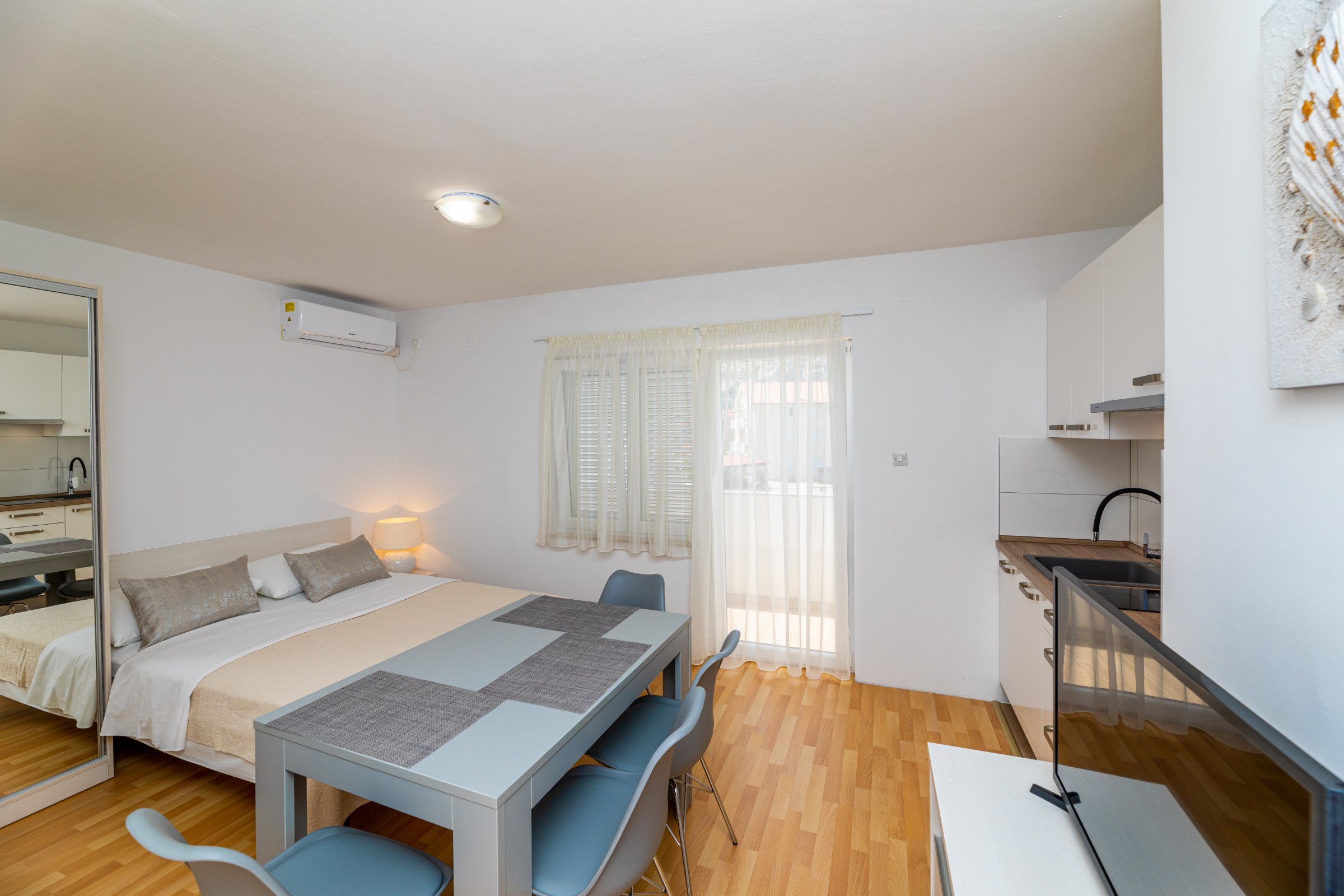 Kuća ima 8 apartmana i 3 studia, svaki ima svoj parking. 2 apartmana su s 2 spavaće sobe, za 4 odrasle osobe ili obitelj s 2-3 djece. 6 apartmana su s 1 spavaćom sobom, za dvije odrasle osobe i 1 dijete. 3 studia za max 2 osobe, br. 5 i 6 su bez balkona, a studio 10 ima balkon. Svi apartmani imaju terasu ili balkon, stol i stolice za sjedenje.