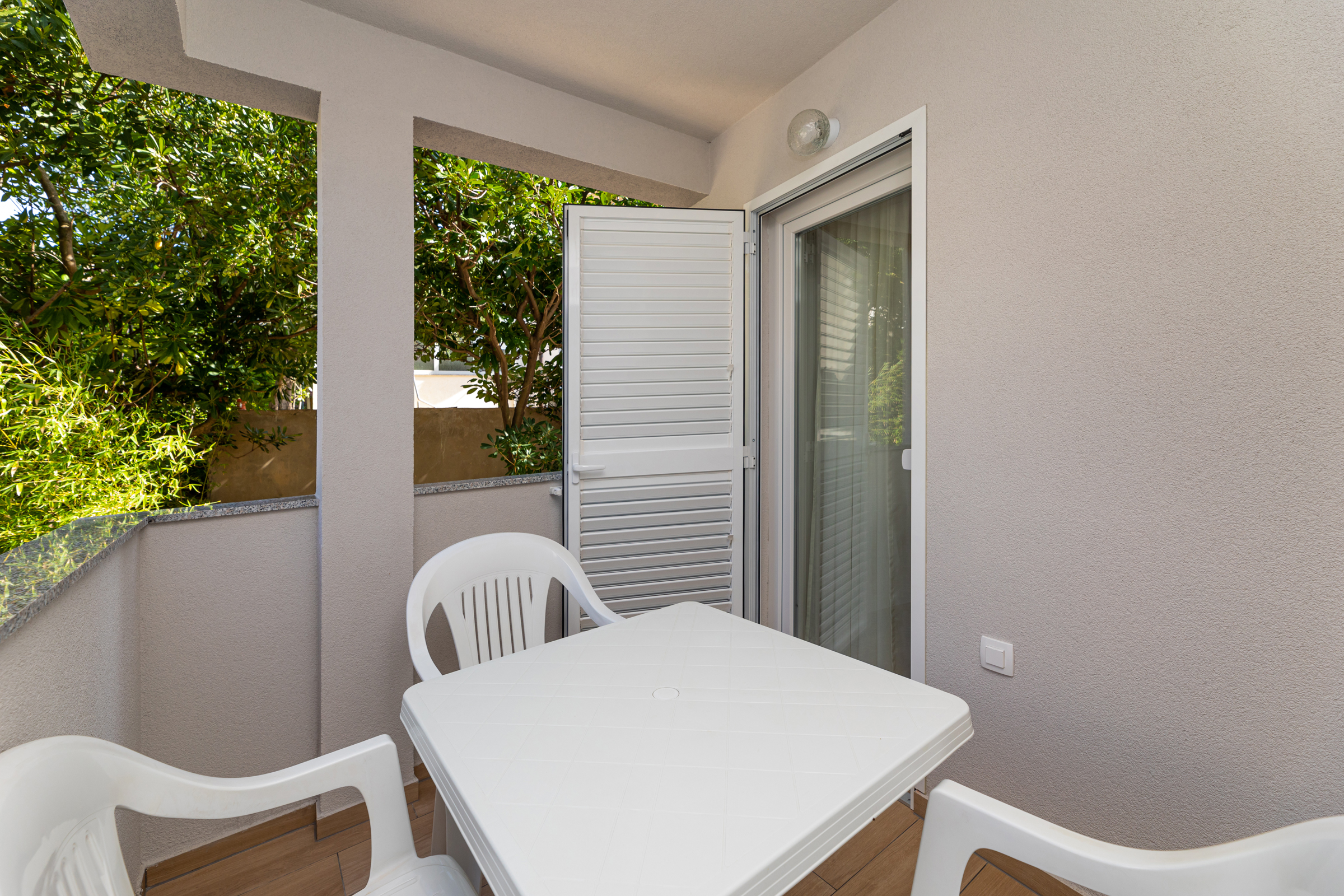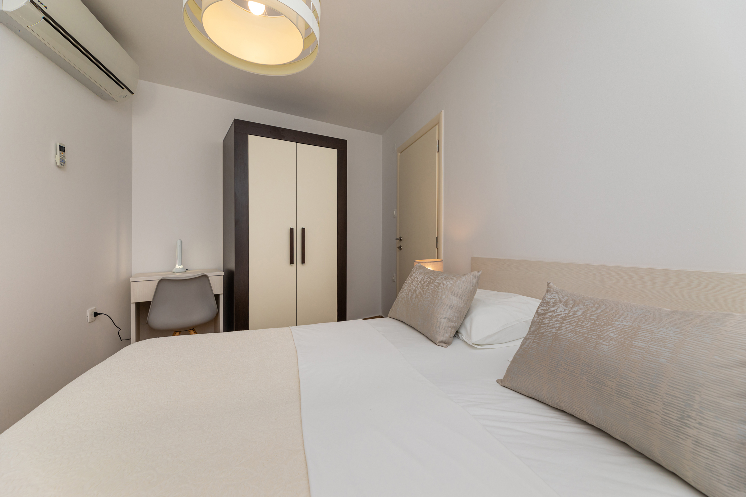 Kuća ima 8 apartmana i 3 studia, svaki ima svoj parking. 2 apartmana su s 2 spavaće sobe, za 4 odrasle osobe ili obitelj s 2-3 djece. 6 apartmana su s 1 spavaćom sobom, za dvije odrasle osobe i 1 dijete. 3 studia za max 2 osobe, br. 5 i 6 su bez balkona, a studio 10 ima balkon. Svi apartmani imaju terasu ili balkon, stol i stolice za sjedenje.