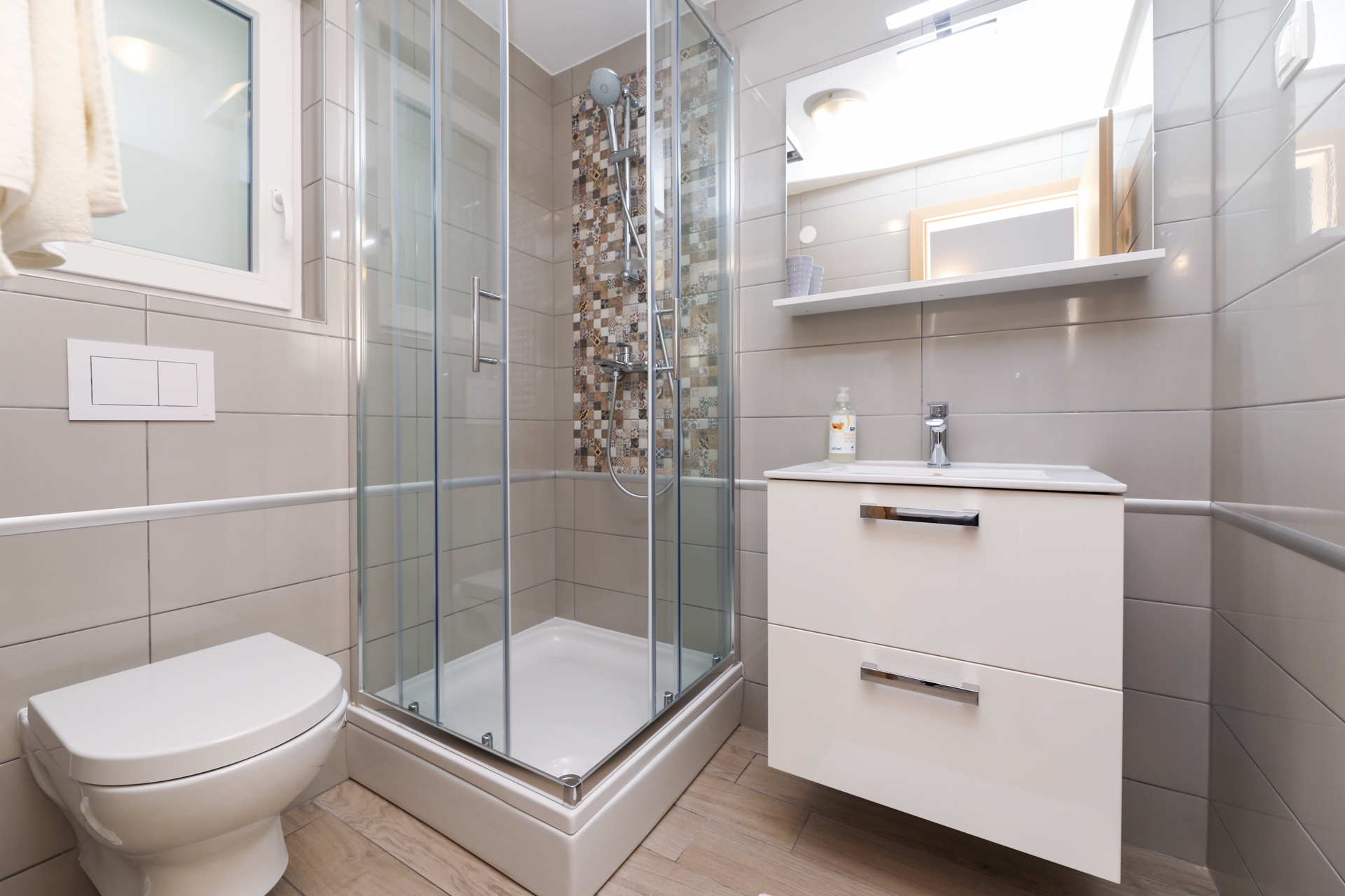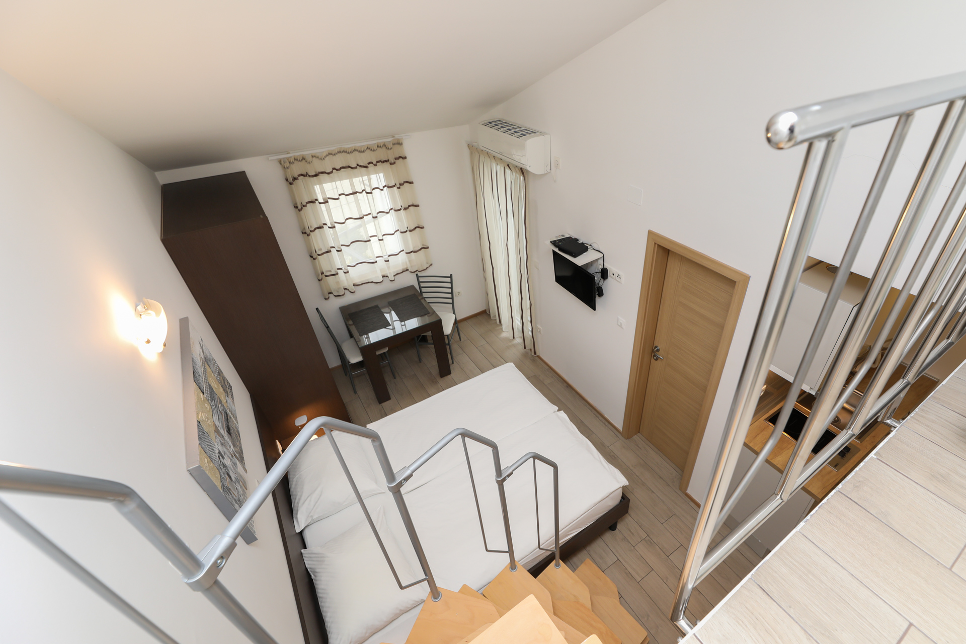 Svi apartmani imaju terasu ili balkon, stol i stolice. Apartmani na 1. i 2. katu imaju balkone sa pogledom na more i panoramom, apartmani u prizemlju imaju terase te izlazak na prostrano dvorište sa vrtnim paviljonom sa 2 grila i namještajem za sjedenje.