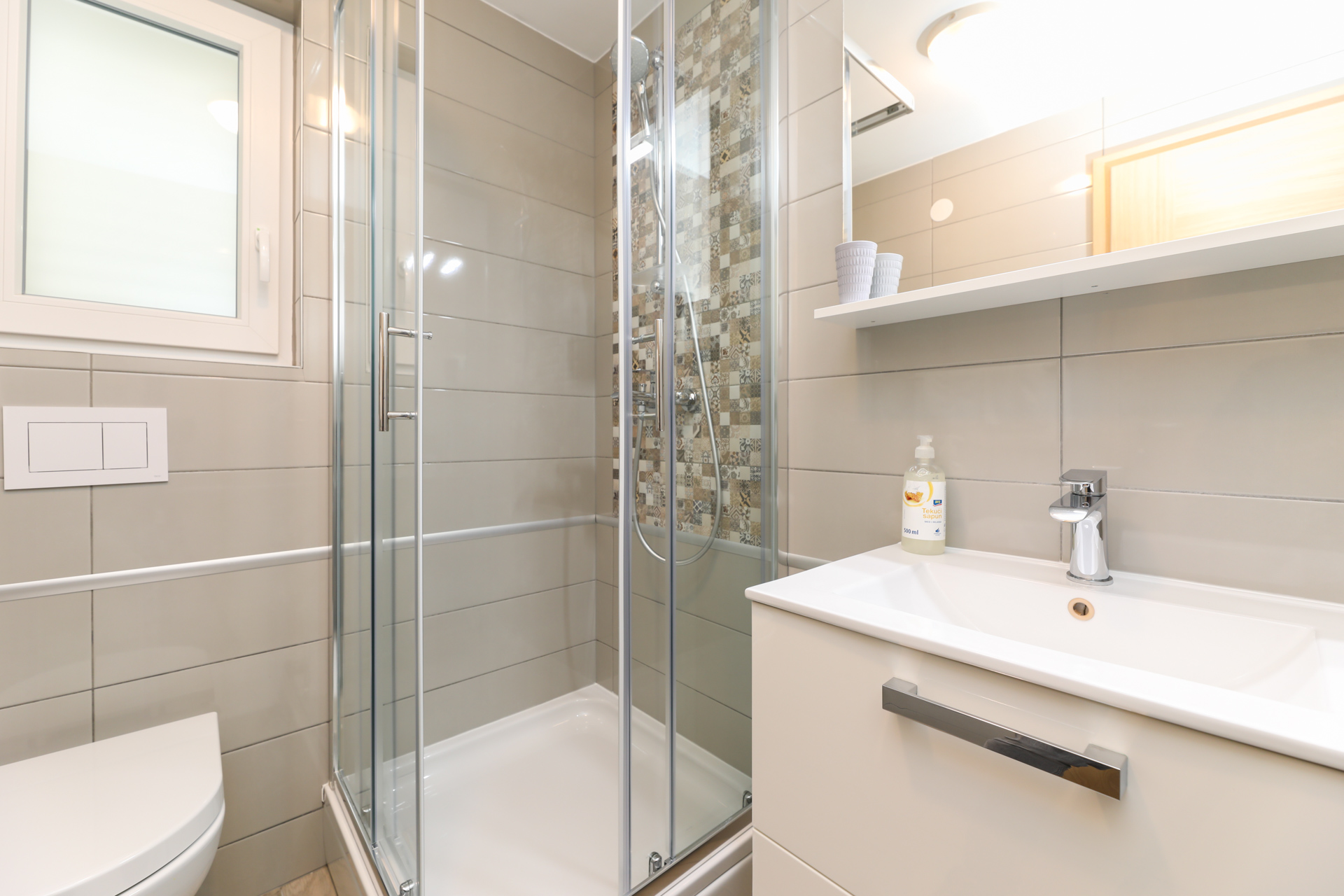 Kuća se nalazi u centralnom dijelu Baške, – 150 m od centra, 200 m od mora, do prve trgovine i restorana je samo 150 m. Kuća ima 18 apartmana, svaki ima svoj parking. Svi apartmani imaju 2 spavaće sobe i kauč u dnevnoj sobi, za 4 odrasle osobe ili obitelj s troje male djece (do 12 godina). Kuća se nalazi na brežulju u centru mjesta na samom križanju između starog i novog dijela grada gotovo svi apartmani imaju prekrasan panoramski pogled na more, luku i stari dio grada.
